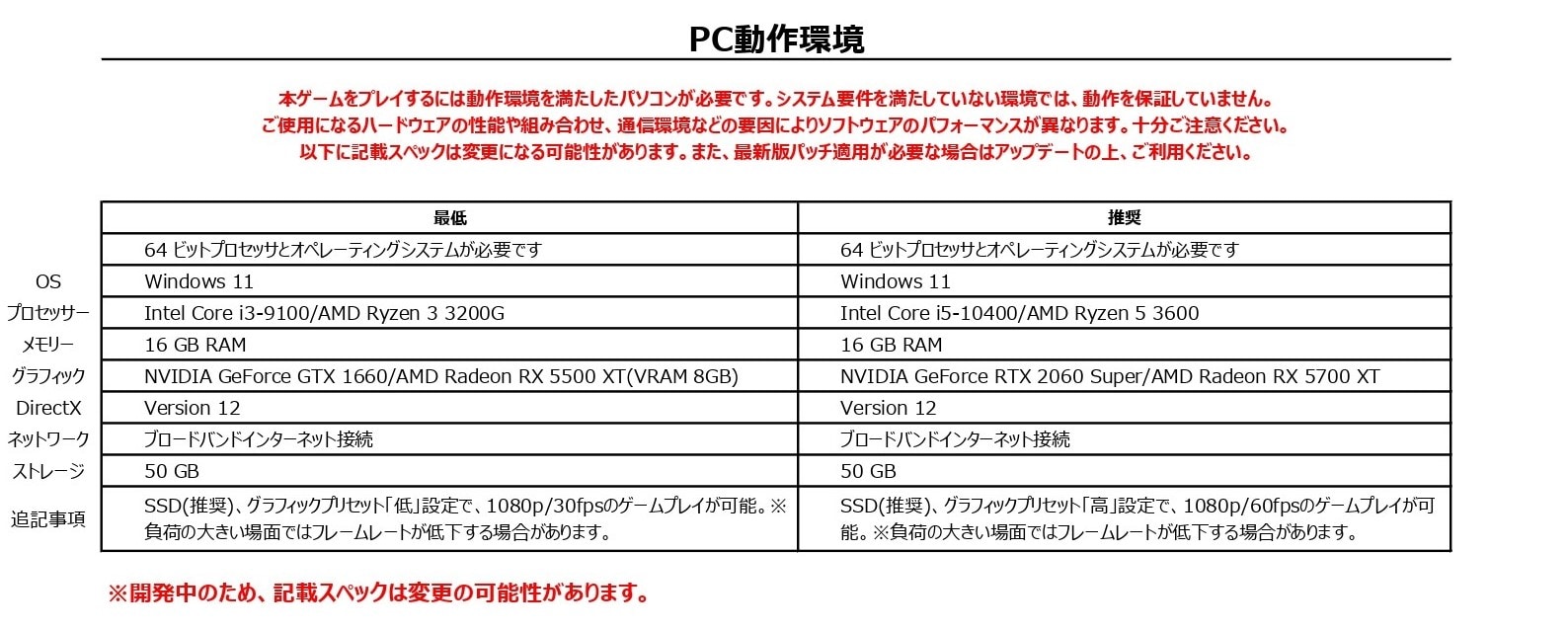 ・備考:SSD(推奨)、グラフィックプリセット「低」設定で、1080p/30fpsのゲームプレイが可能。