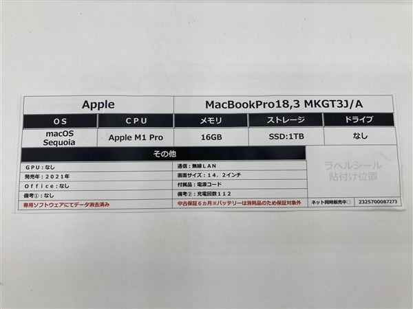 | 商品名 | 【中古】【安心保証】 MacBookPro 2021年 MKGT3J/A |