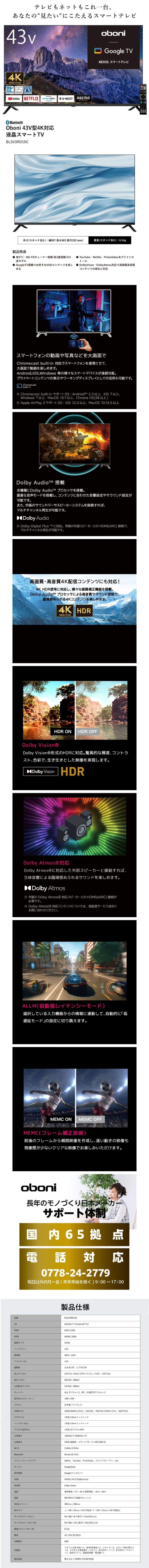 | 商品名 | 【新品】Oboni 43V型4K対応液晶スマートテレビ BLS43RD10C/ドウシシャ |